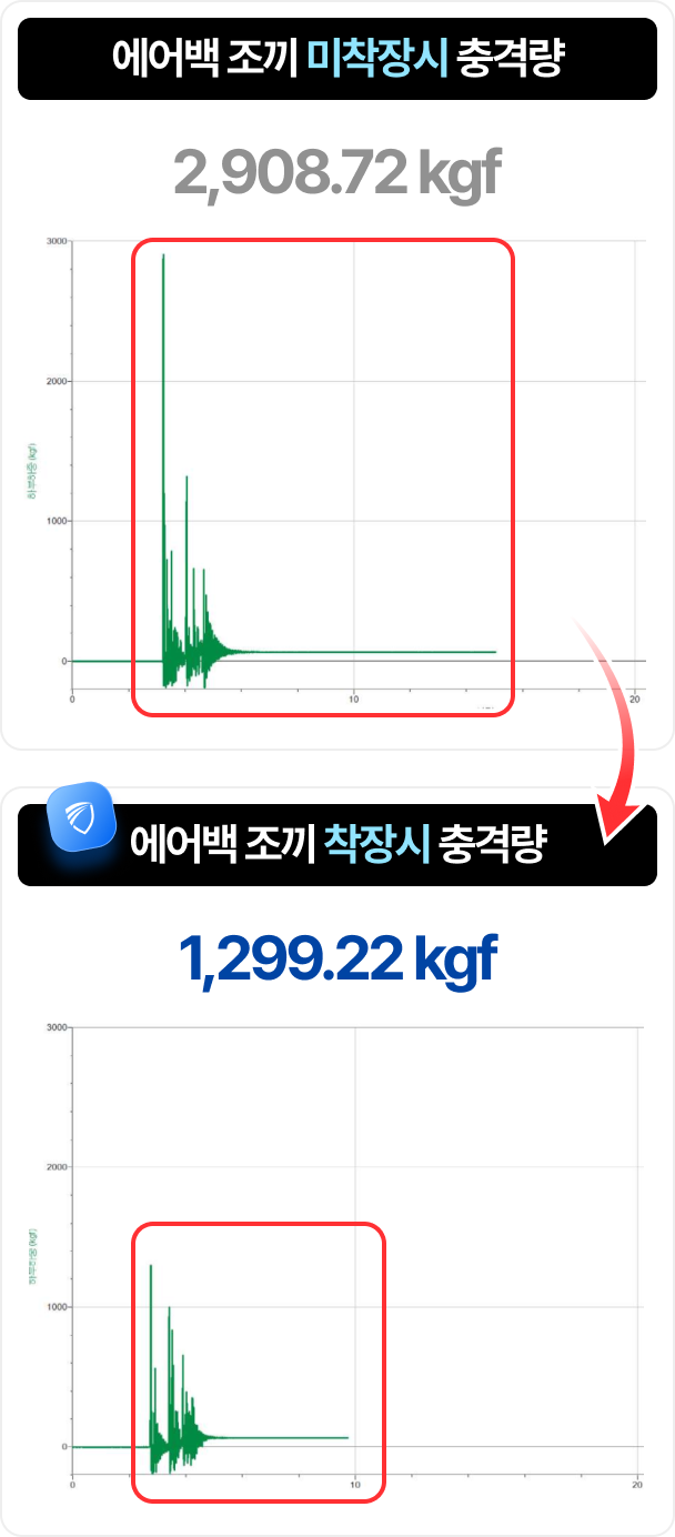 시험 장비는 일정 범위 이상의 충격값을 기록하지 않는 사양을 갖고 있어 실제 충격 저감 효과는 표기 수치 이상일 수 있습니다.